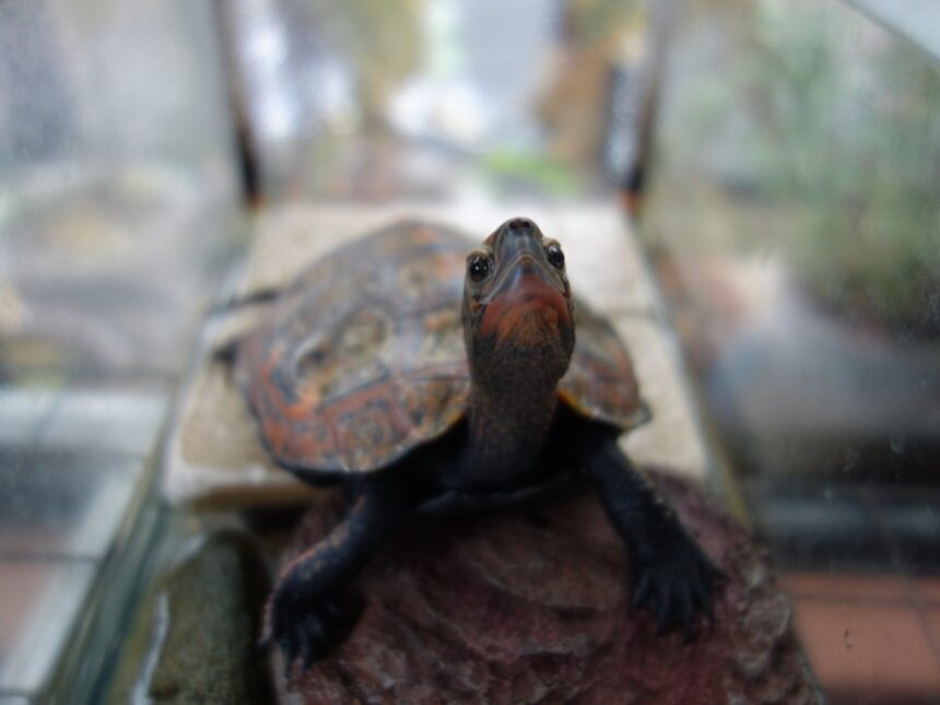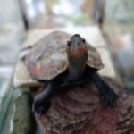 飼育1262日のニホンイシガメがカメ島の上で甲羅干ししているところ。2023年は甲長が1cm伸びました。