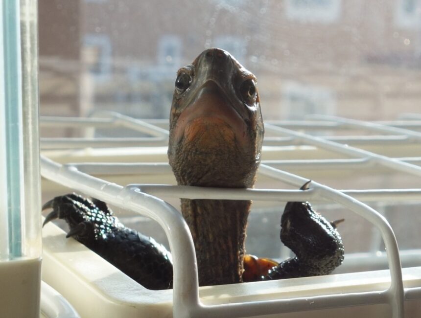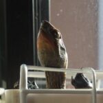 窓辺で日光浴中に水槽の蓋から顔を出している飼育1614日のニホンイシガメ