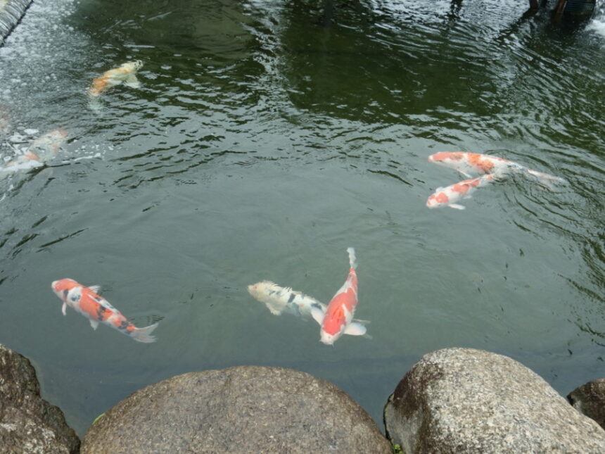 鹿児島市の照国神社の近くの歩道脇の池にいるニシキゴイ。 (2023年5月4日10:51撮影)