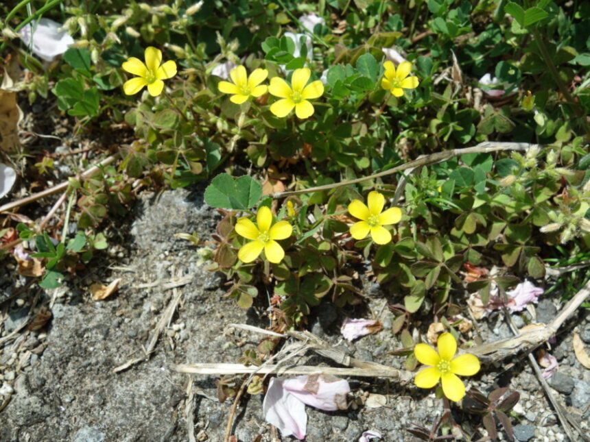 公園の横の道路のガードレールの下に咲いていたカタバミ(傍食)。 ムラサキカタバミは紫色をしています。 (2023年4月1日11:28撮影)