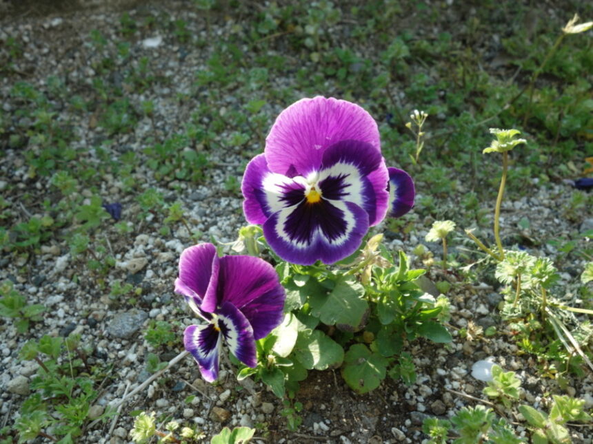 公園に植えてあるパンジー。 夕日に映えています。 人の顔のようになってきました。 (2023年4月2日16:47撮影)