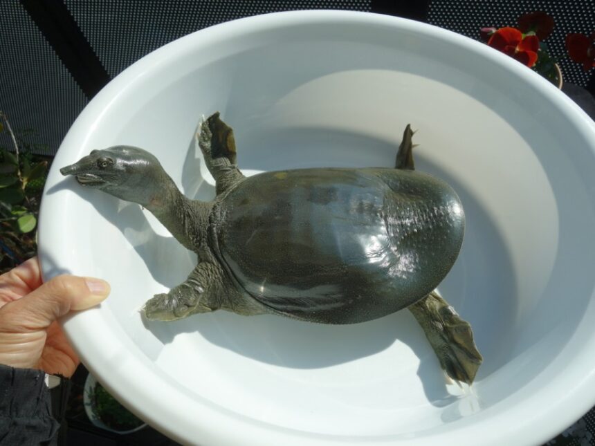 日齢1561日の5匹のCHスッポンの中でいちばん大きい個体♀をたらいに入れてベランダで久しぶりに日光浴させました。しばらくすると口を開けて手足をピーンと伸ばしました。現在の甲長は約23cm。