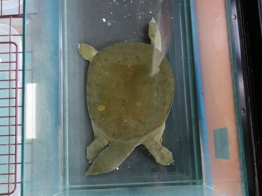 日齢1862日のスッポン♂の背甲にできた10個ぐらいの斑点。現在の甲長25cm。