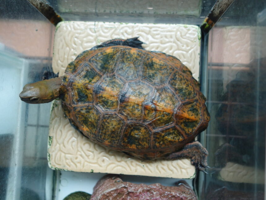 ブロックの上で角度を変えて甲羅干ししている飼育1168日目のニホンイシガメ。やはり左側 の後ろ足を出しています。