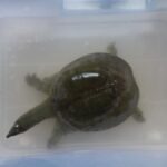 水の中から側壁の向こうの飼い主を見ている飼育1168日目のニホンイシガメ。(2023年9月28日15:26撮影)