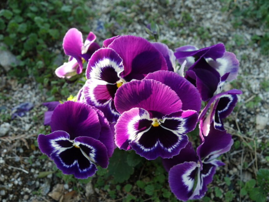 近所の公園に植えてある紫色のパンジーが夕日に照らされて輝いていました。(2023年3月13日17:29撮影)