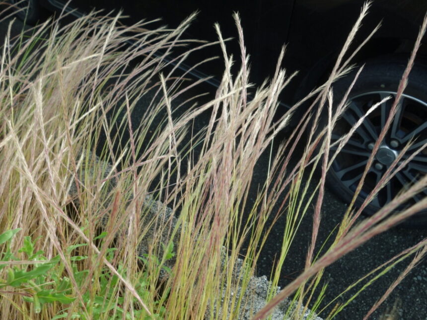 アイキャッチ画像は近所のアパートの駐車場の端に駐車している黒い車の横の植え込みに生えているナギナタガヤ(薙刀茅)。 (2023年5月19日17:17撮影)