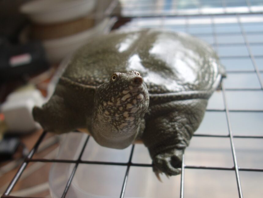 飼育910日目のシナスッポン♀が自分のガラス容器から隣の容器の蓋のワイヤーラティスに登って私の近くに歩いてきました。