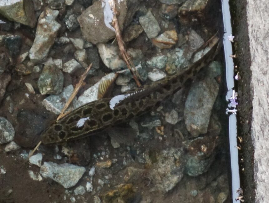 住宅地の水が少なくなった側溝にいた小さいライギョ