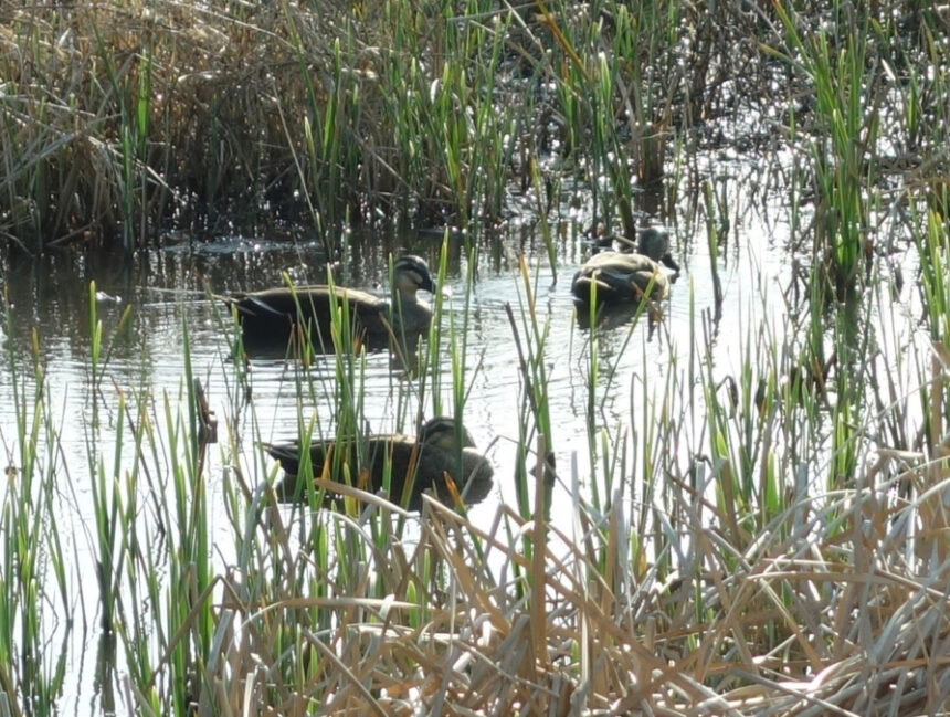 公園の隣の湿地帯にいた3羽のカルガモ。