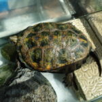 日齢1267日のスッポン(甲長12cm)がバスキング&シェルターの上に乗って日光浴しているところ。