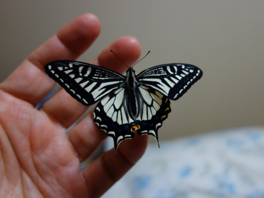 とりあえずこのアゲハはベランダのシークヮーサーの鉢植えの枝に這わせました。