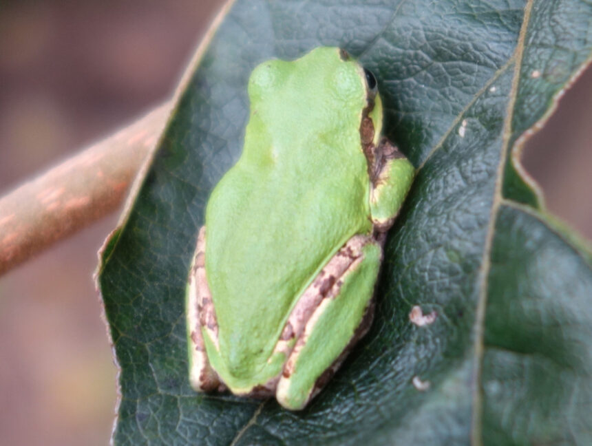 アマガエルが柿の木の葉っぱの上にいるところを写真に収めました。