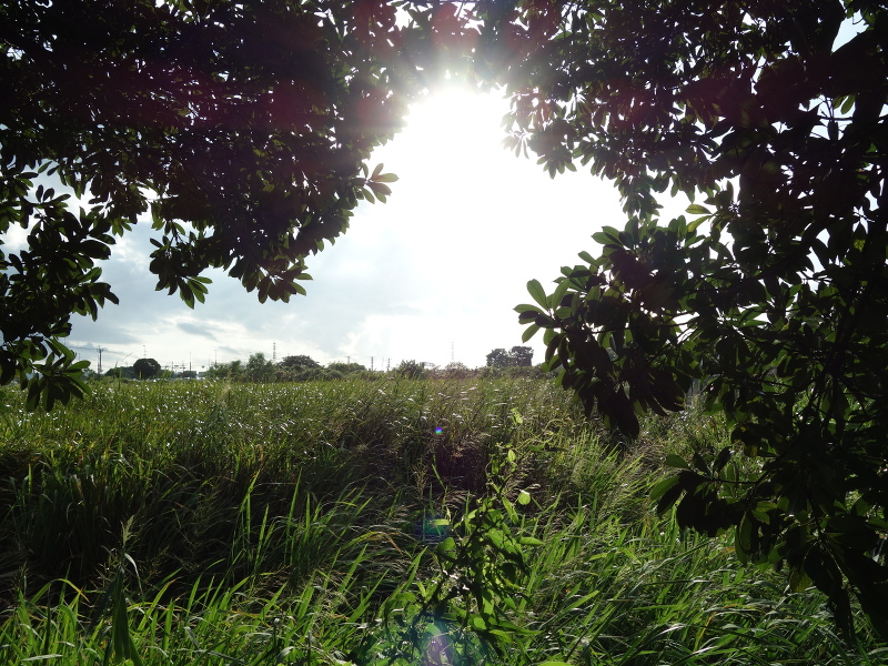 夕方のウォーキングの時にいつも行く公園の懸垂をする場所(折り返し地点)にあるマテバシイの木の間から見える夕日と葦原。この葦原は湿地帯で、5〜6年前までは白鷺などがたくさん飛来していました。(2025年9月28日16:34撮影)