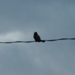 フェンスから電線に止まりました。そして、この後、用水路の浅瀬に降りて水浴びを始めます。(2020年4月15日17:16撮影)