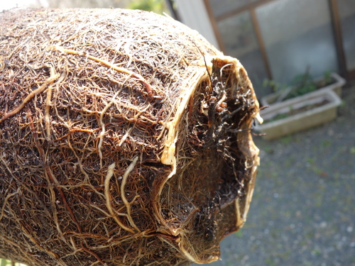 No.1の方が枯れてきました。根詰まりを起こしているとかんがえられます。そこで、鉢を一回り大きくすることにしました。