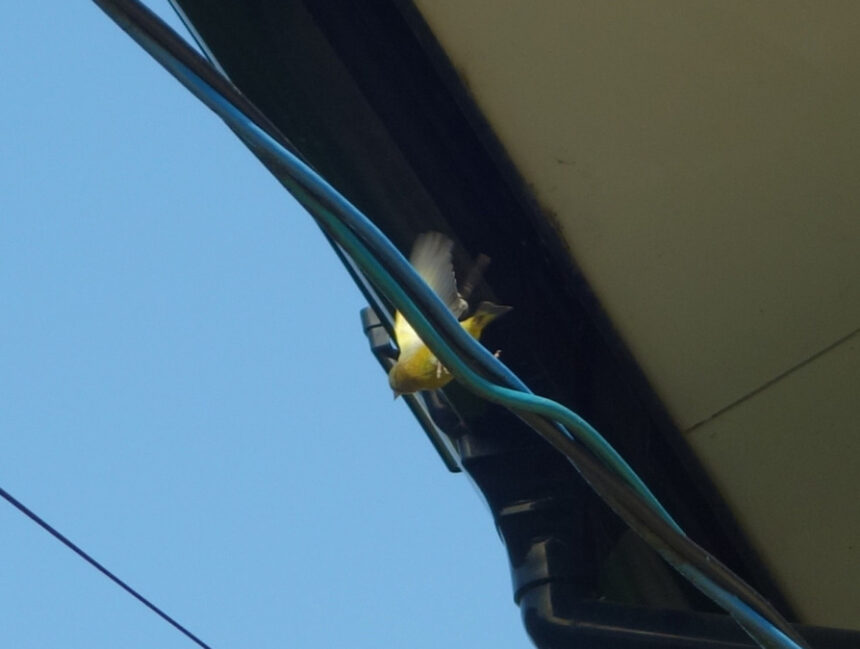 1羽のカワラヒワが民家の電線に止まっていました。