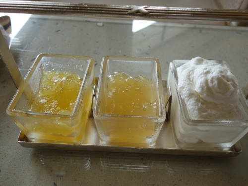15:35撮影。シークヮーサーのジャム(左)、マンゴーのジャム(中央)、生クリーム(右)