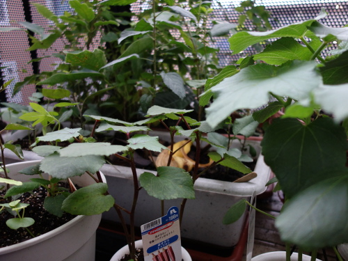 赤オクラも徐々に育ってきましたが、ジャンボオクラは停滞しています。。