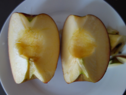 まず半分を食べます。芯をくり抜いた時の様子。蜜は入っていません。サクサクしていて、とても甘かったです。酸味もほどよくありました。