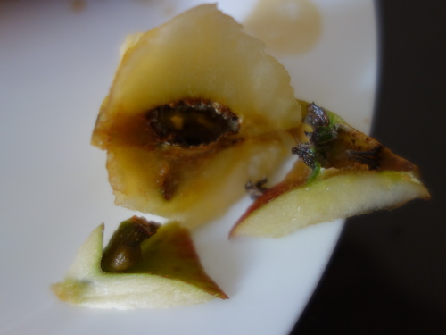 このりんごには種が入っていませんでした。芯の部分が小さいのが特徴的です。もしかしたら種なしりんごができるのではないでしょうか。でも、桃の例もあるので無理かな。