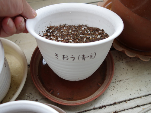 鉢に名前を書いておきます。2015年10月6日(火)現在、何も変化はありません。No.1と同様、やはり冬を越さないと発芽しないような感じです。