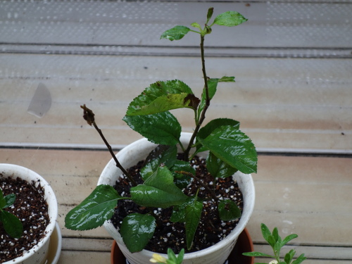 沖縄島オクラをプランターに移植するために、きおうのNo.2の実生をドミノ式にプランターからさんさりんごと高徳の実生を植えた鉢に3本目として移植しました。手前がきおう(No.2)の小さい実生苗、右奥が最も生長したさんさりんごの実生苗、左奥が高徳の実生苗。