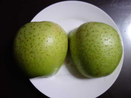 早生王林はジャンボ王林といわれるだけあって、大きかったです。食べた感じでは、早生王林は皮も果肉も硬く、切った時の断面は茶色になりやすく、酸味は少なく、甘い青リンゴでした。