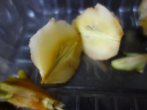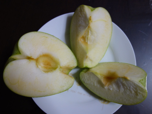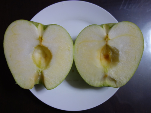 2本発芽していました。果肉は硬いです。青リンゴ系は硬いという印象を私は持っているのですが、この早生王林(ジャンボ王林)は硬かったです。秋映えとほぼ同時に食べてみたのですが、秋映えより甘いという印象です。でも、酸味は秋映えの方があるようです。また、秋映えの方がやわらかな食感でした。