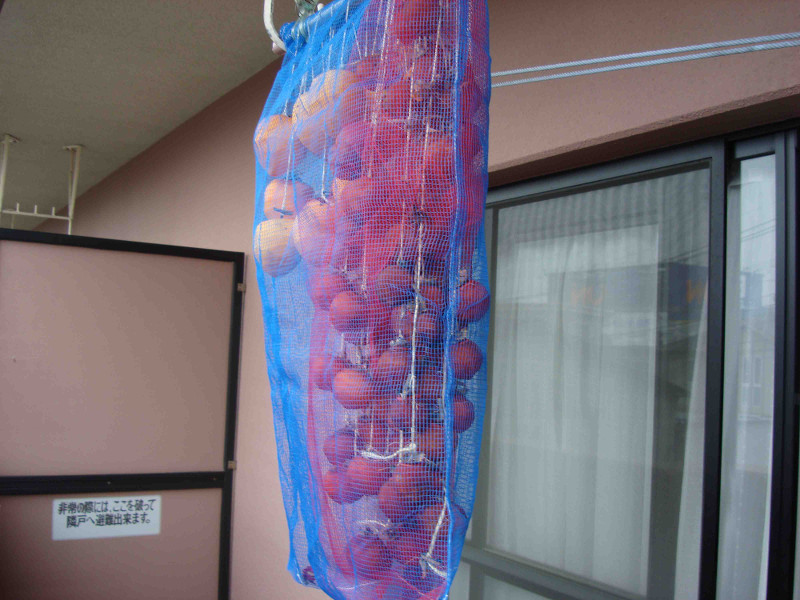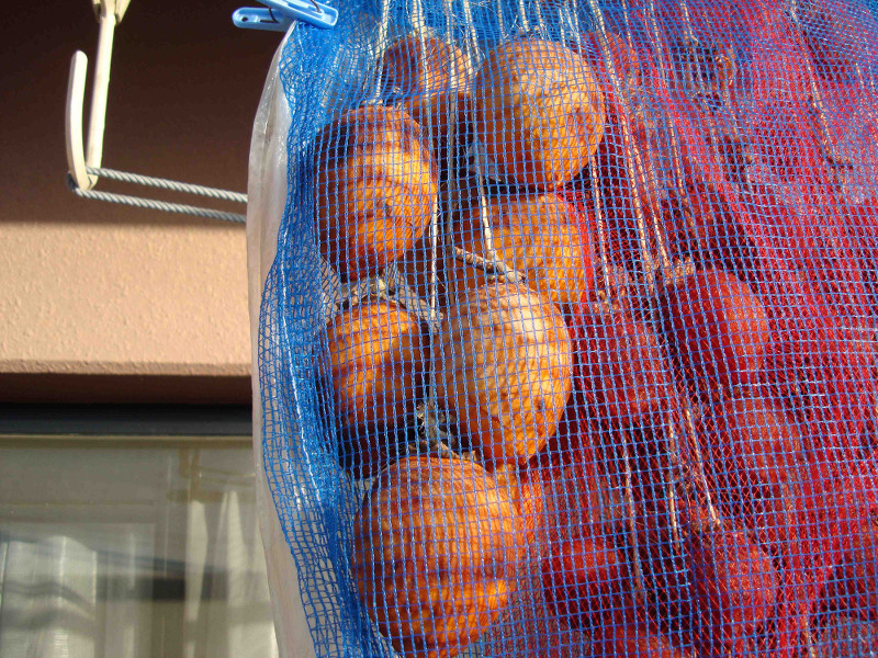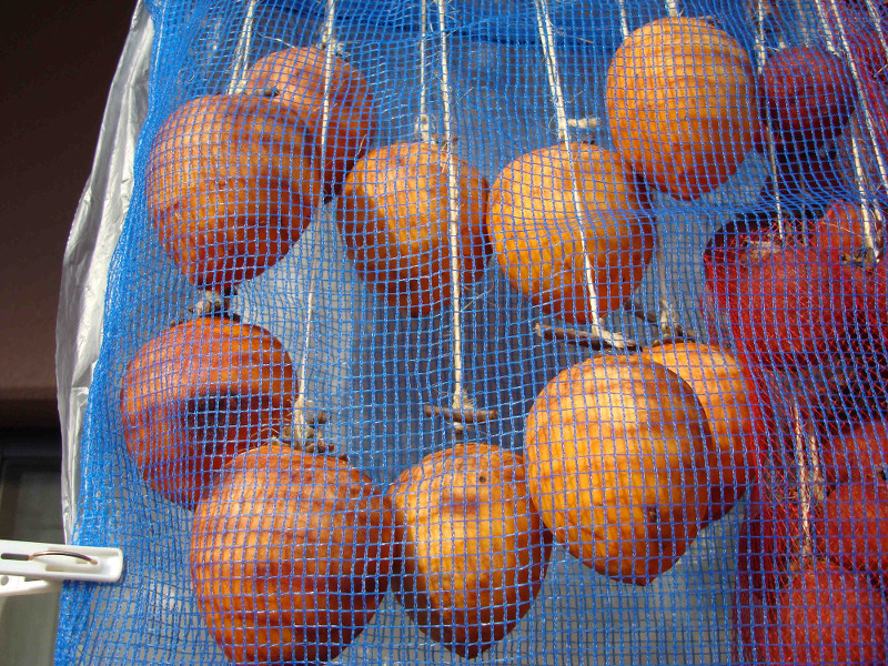12月1日(土)夕方に近所のスーパーから愛宕(あたご)柿というとても大きい渋柿を買ってきました。徳島県の美馬というところが産地となっていました。一方で別の商品は愛媛県産の表示もあり、どれが本当なのかはっきりしませんが、いずれにしても四国から来た柿のようです。重かったので帰ってから重さを量ってみたら1個340グラムもありました。10個で3kg以上になります。12月2日(日)、皮を剥いてから、重いので2個ずつ紐で結んで物干竿にかけました。大きいので出来上がりは遅くなりそうです。