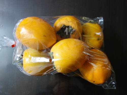 愛媛産の愛宕柿です。他の袋は扁平で大きな柿が入っていましたが、それも愛宕柿だったのでしょうか。よくわからなかったので、尖った柿が入った袋が1つだけあったので、それを買ってきました。私の記憶ではこの形が愛宕柿でした。