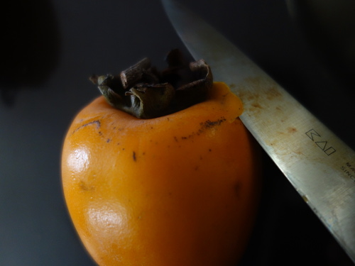 果柄が取れてしまっている柿が1個ありました。これは紐を付けられないので、果柄のまわりに切り込みを入れて、そこを紐で巻いて固定しようと思いました。