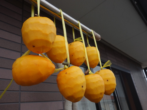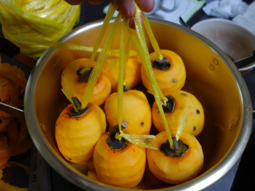 1個だけ横になっているのが果柄が取れていた柿。中に紐が貫通しています。