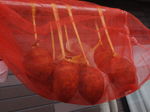 腐った柿は捨てたので、柿は7個になりました。網目の小さいネットに替えました。2枚重ねにしました。