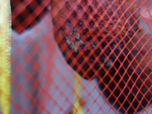 中に紐を貫通させた柿は中が腐ってきました。そこにショウジョウバエが群がっていました。この網目ではネットの意味がなかったようです。