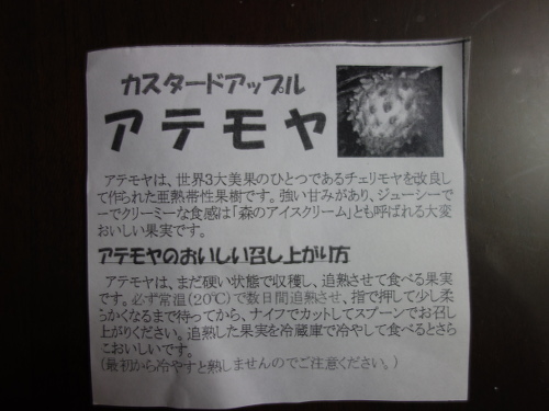 アテモヤという熱帯果実を那覇空港の売店で買いました。熊本に戻って数日熟成した後に食べてみました。洋梨の食感に甘味と程よい酸味と芳香がありました。フェイジョアのような食感と味がしました。かなり美味しいと思いました。