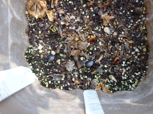 そのあと、種を上から落としました。地中にあった種は黒く、割れているのもありました。土も全部移したので今回移した種は種は全部で22個あるはずです(22個は確認できていません)。元々4個があったので、それらはあとからかぶせた土に埋没した形になります。