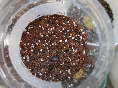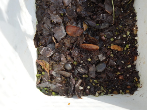 2017年3月24日、丸い浅底の鉢に種を移しました。土はひっくり返してそのまま用いました。種は全部で22個あるはずなので、1個ぐらいは発芽してほしいです。元々あった種は4個ですが、地中に深く埋もれてしまいました。それらも含めると26個になります。1個ぐらいは発芽してほしいと思います。