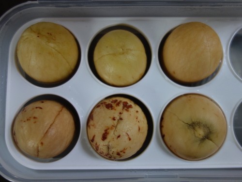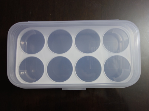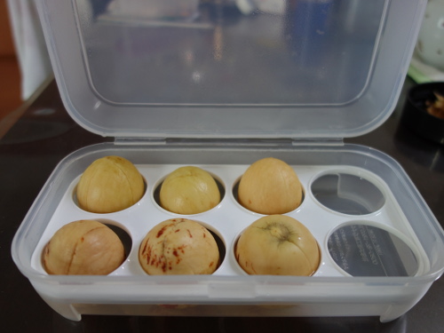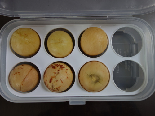 2016年12月9日に買ってきたニュージーランド産の卵型のアボカド3個の種と、12月14日に買ってきたメキシコ産卵型のアボカド3個の種、合計6個を水栽培します。しかし、容器を6個で栽培すると管理が大変なため、1つの容器で行えれば簡単だと思いました。そこで、百均のダイソーから卵ケースを買ってきました。6個ともケースの中の穴に何とか収まったので、しばらくはこの容器で水栽培を継続できそうです。根が出てきそうになったら別の容器に移す計画です。卵ケースに並べて管理すると大きさの比較にも好都合です。直接手で種を持ち上げて観察するのが最も確実ですが、種を容器に入れたまま、容器の底面から見れば種の底面の変化も観察可能です。