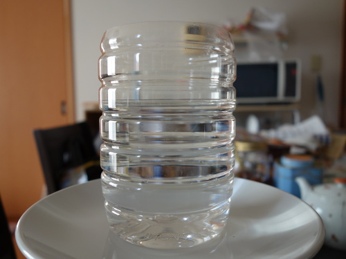 醤油が入っていたPETボトルを切って、水を満杯にして重さを量りました。そして、果実を入れてこぼれた水の重さを引き算で算出しました。それを体積に換算しました。水の密度は1.0g/cm3としました。
