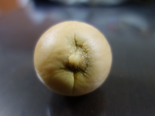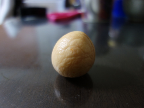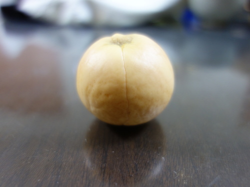 カッターの刃で種の薄皮を持ち上げる時に付いた傷のところが赤褐色になっています。アボカドの種Cの頂部が他の2個とは異なっていることがわかります。Cの種はどこから見て左右対称の形をしています。