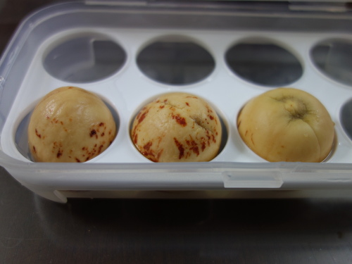 百均のダイソーで買ってきた卵ケースに入れたアボカドの種A(左), B(中央), C(右)。Cはちょうど卵ケースの穴にはまりました。重い順に並べるとC>B>Aとなります。果柄の太い順に並べるとB>A>Cとなります。果柄の太さは関係ないことがわかります。