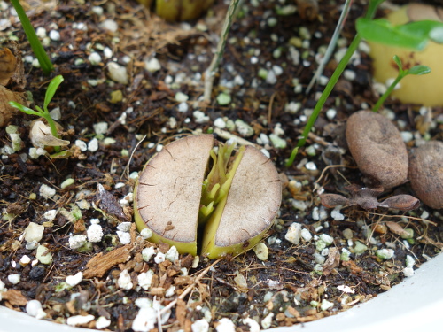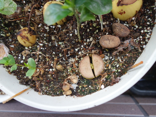 芽が出てきました。種を大幅に切っても芽が出ることがわかりました。しかも、切り落とした方が障害物がなくて垂直に出てきやすいような気がします。