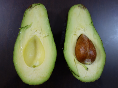 アボカドの種。果肉が固いので種にはあまり付着していません(取り外してそのまま撮影)。