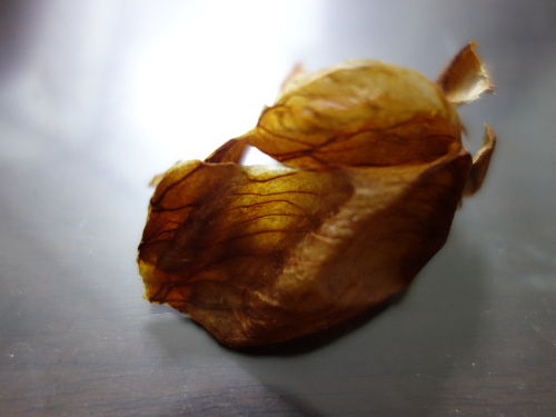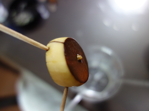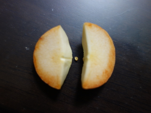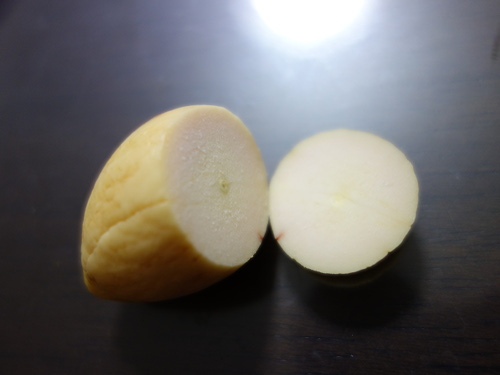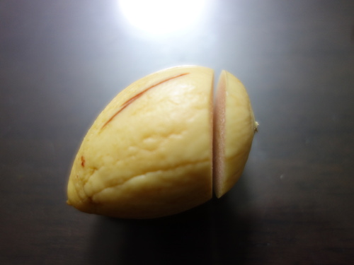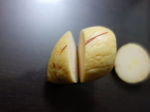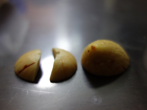 切除した底部を割れ目に沿って割った時に、種の中の芯がほんの少し切れてしまっていることが確認できました。