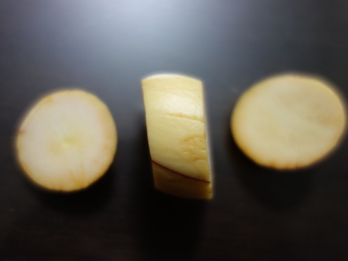 アボカドの種No.2は底部を7mm、頂部を15mm切り落としました。切る際には2つの断面ができるだけ平行になるようにしました。それによって種のサイズが最小になります。切ったあとの種の高さは約15mmとなりました(14mmから16mmの高さで平均15mm)。このように種が少なくなった状態でもちゃんと発芽するのでしょうか。種に含まれる養分が少ないので、発芽しにくいことも考えられます。水栽培で実験します。