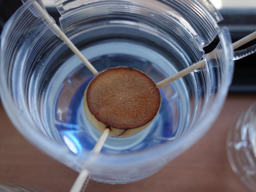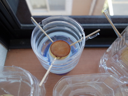 底部を7mm切り落としたら芯に1mmほどかかってしまい、その分を切り落としてしまいました。これがどういう風に影響するかはやってみないとわかりません。種のサイズはかなり小さくなりました。発芽してくれるのでしょうか。水栽培は肉眼で変化を観察しやすいメリットがあるので、底面の変化を毎日観察していきます。発根・発芽したら、鉢植えに替える予定です。