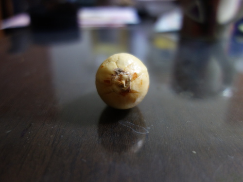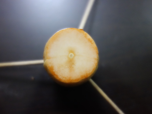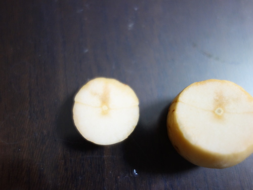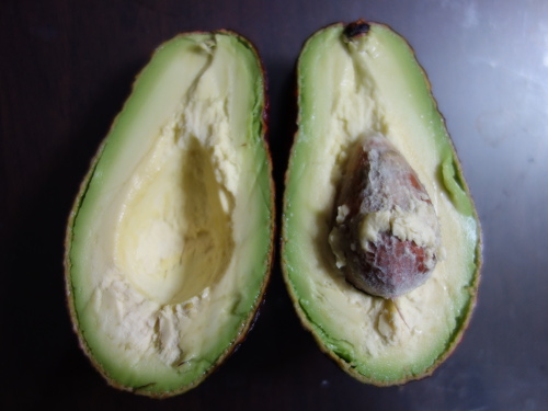 アボカドNo.4を割りました。種の大きさはどちらかといえば小さいですが、No.5<No.3<No.4となり、果柄の大きさの順番No.3<No.4<No.5と一致しません。