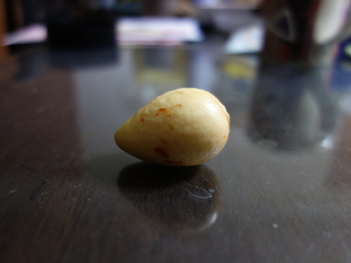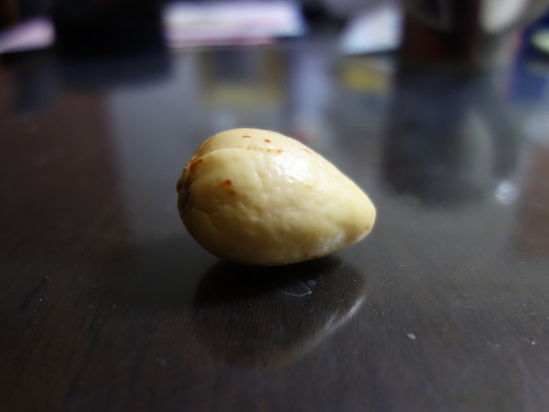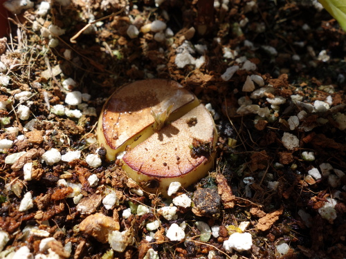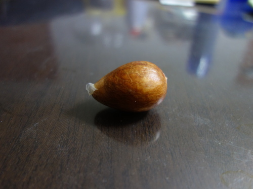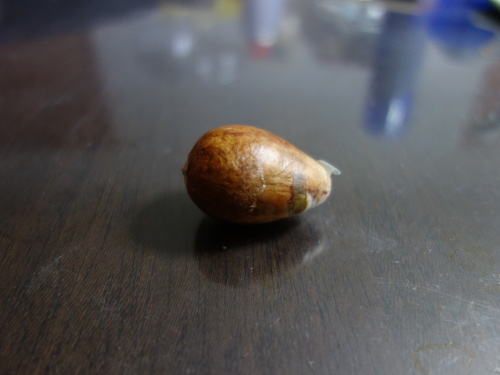 それから2週間の2017年1月6日、根が5mmほど伸びました。種を切りすぎても発根はするようです。あとは、上の方に芽が出て来るかどうかです。もし上の方も問題なく発芽するようであれば、頂部と底部を切ってやった方が早く発芽するように思います。特に頂部がジグソーパズルのようにがっちり固定された種もけっこうあるので、そういう種は特に切ってやった方がいいと思います。