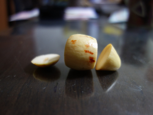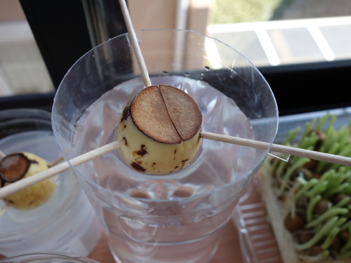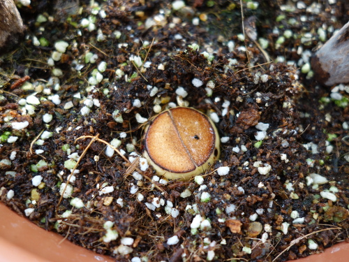 底部を切り落とす時は厚さを6mm以内にとどめておいた方が無難のようです。根が出て来る部分に1mmほどかかってしまいましたが、これが発芽実験にどう影響するのかは不明です。たぶん大丈夫ではないかと考えています。根がどのように出てくるのか興味があります。